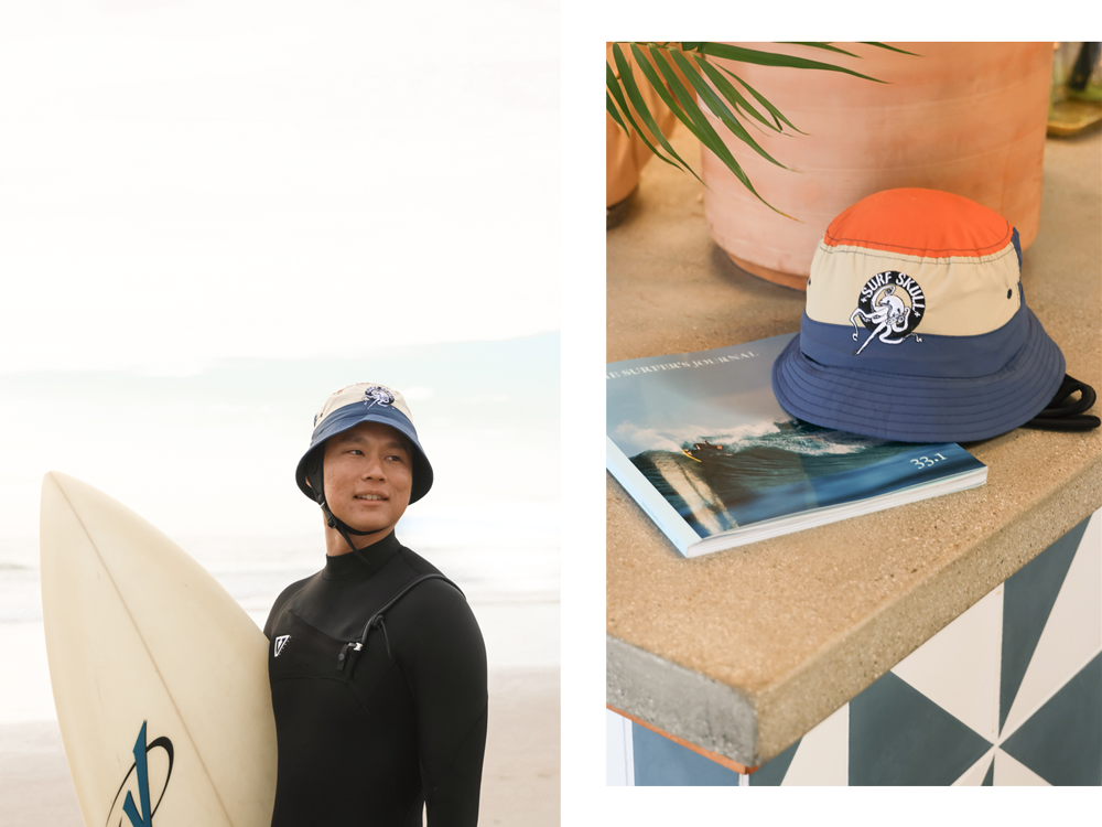 We're Surf Skull™ we make a surf-helmet disguised as a bucket hat.